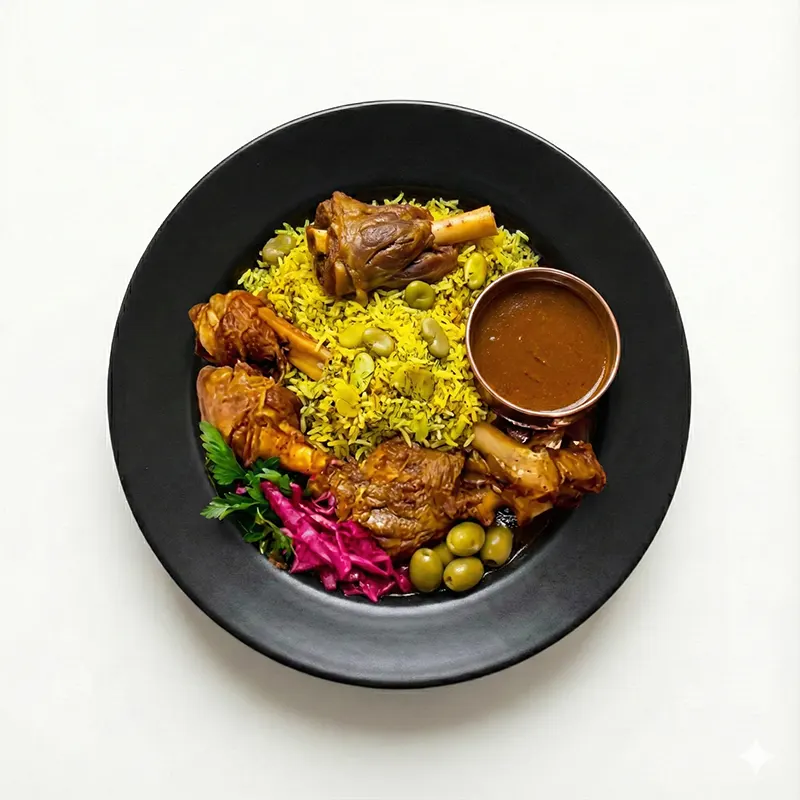 Gröna bönor. Dill. Ris. Lammmuskel. Paprika. Lök. Tomatpuré.